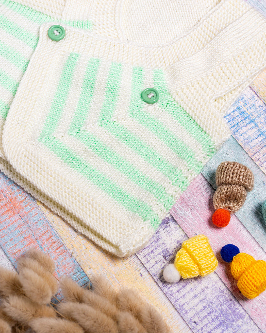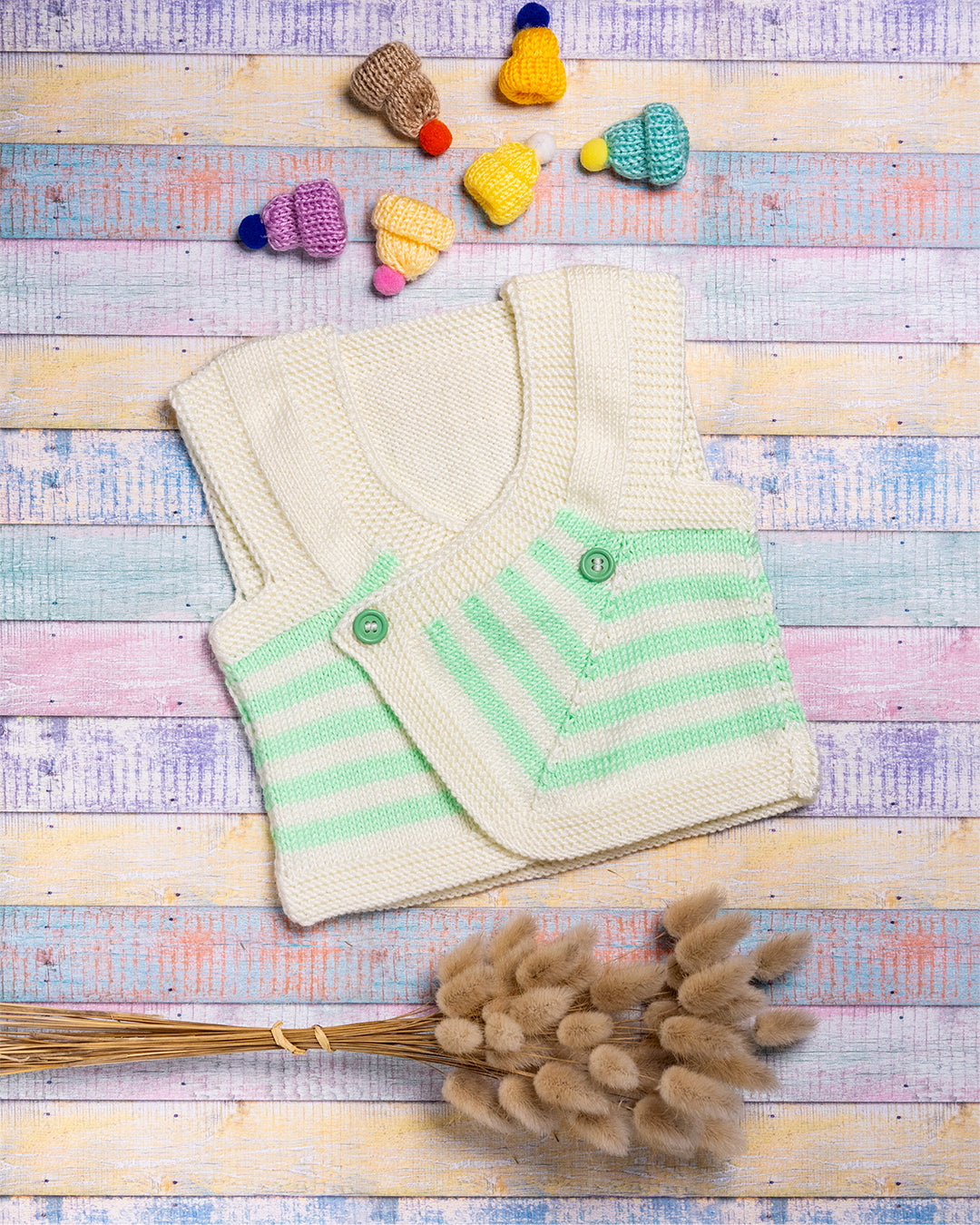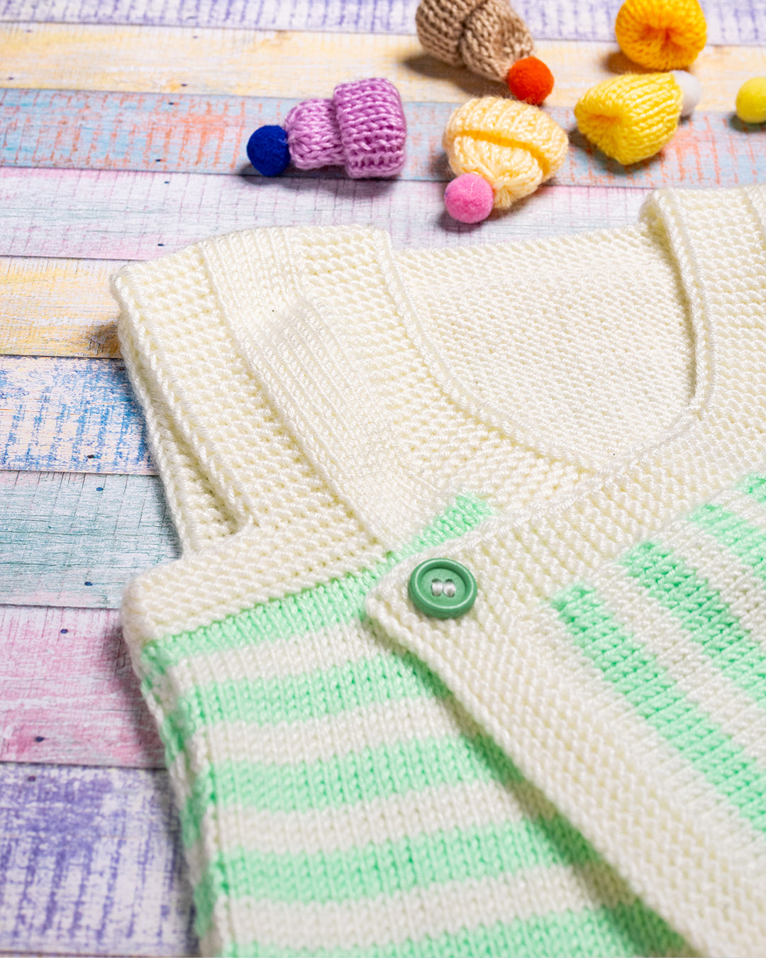 Ročno pleteni telovnik v belo-zeleni barvi iz 60% svile, 30% volne in 10% kašmirja.