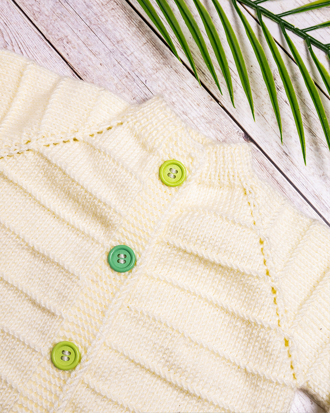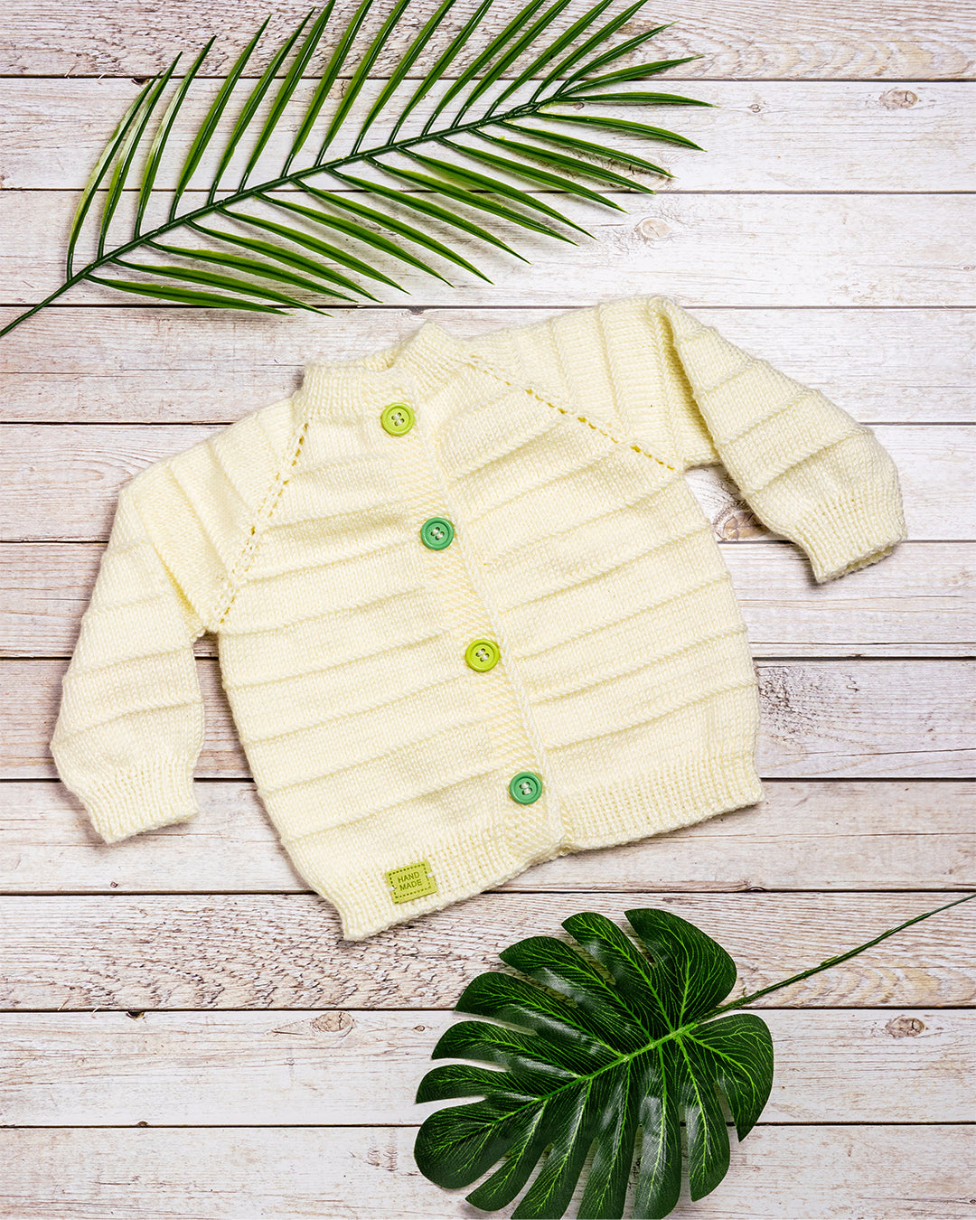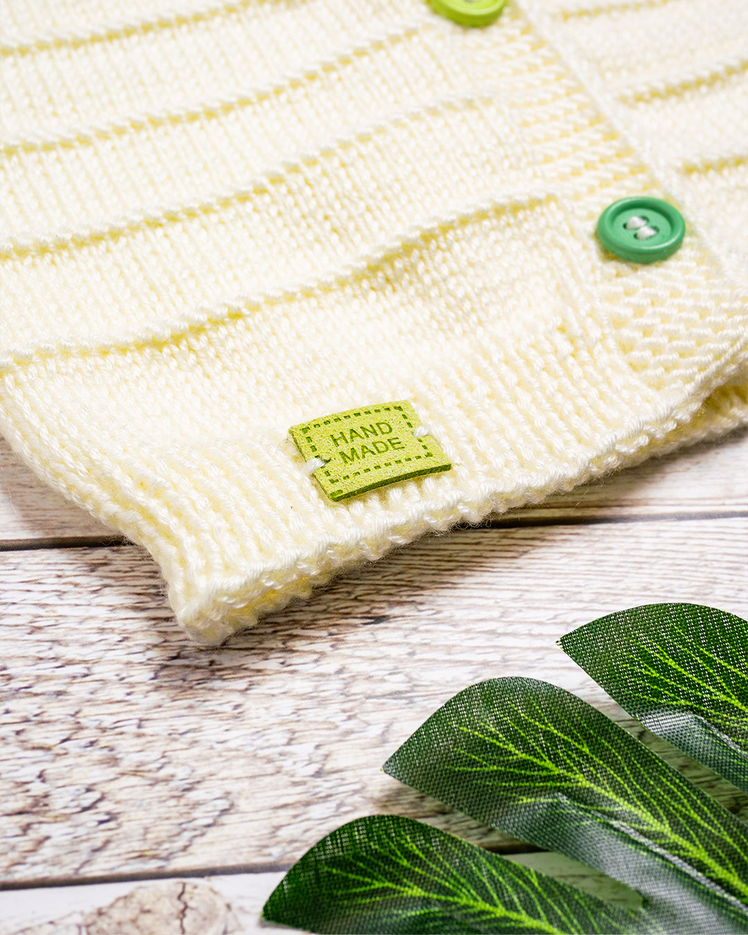 Ročno pletena jopica z zelenimi gumbki iz 60% svile, 30% volne in 10% kašmirja.