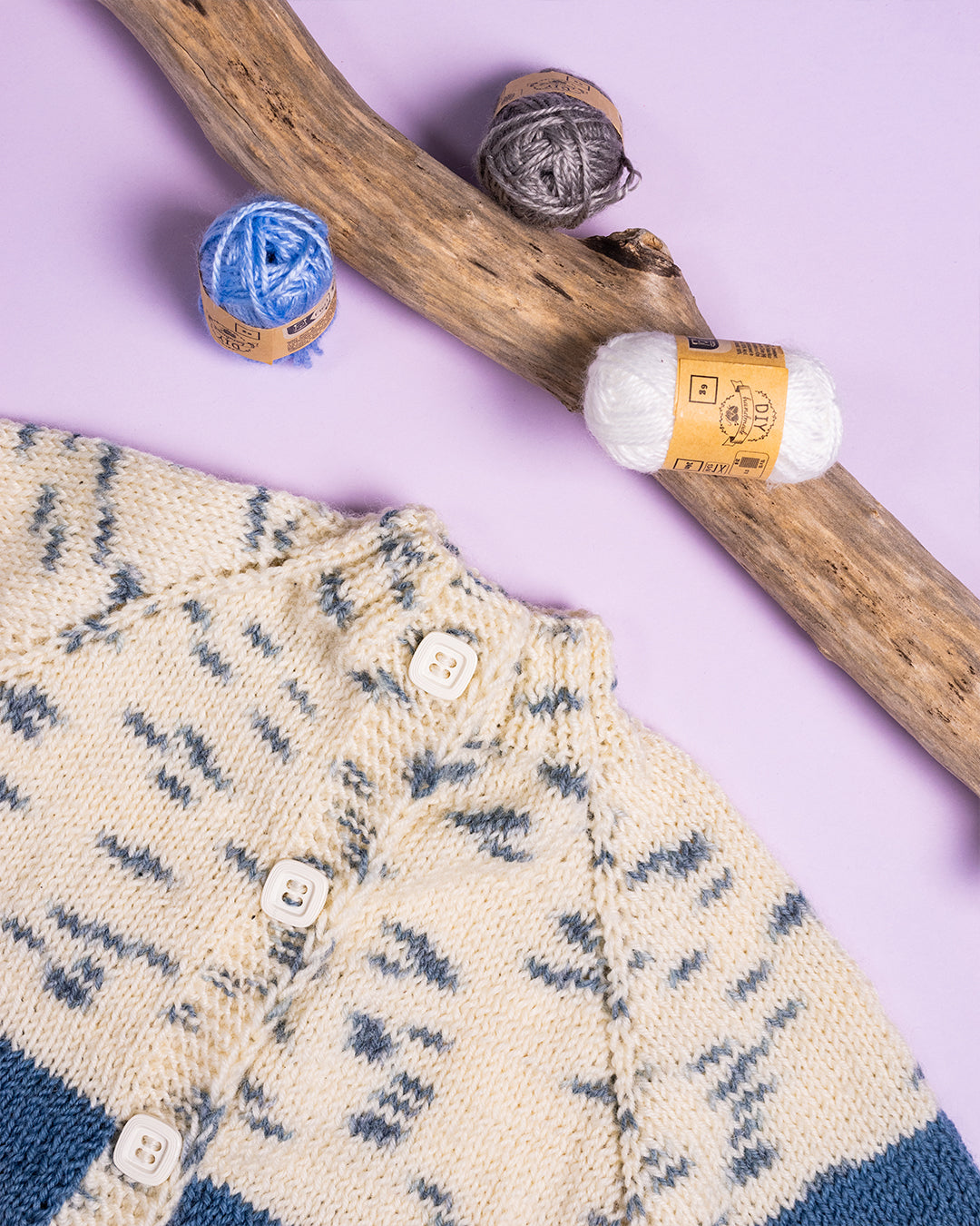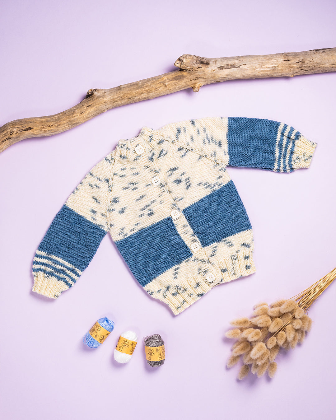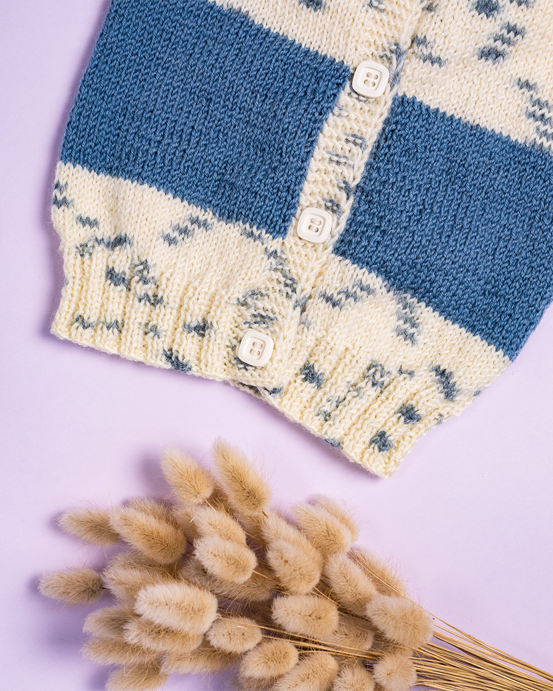 Ročno pletena pisana jopica z kombinacijo modre volne iz 92% avstralske volne in 8% žameta. Kombinirani del iz modre volne je iz 100% bombaža.