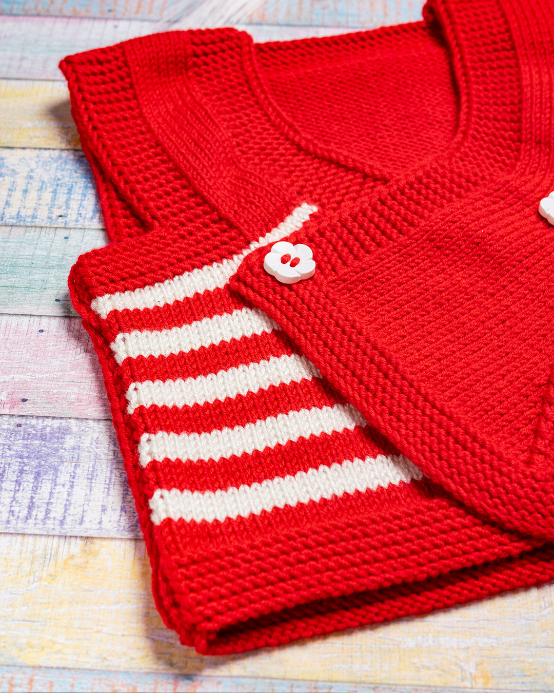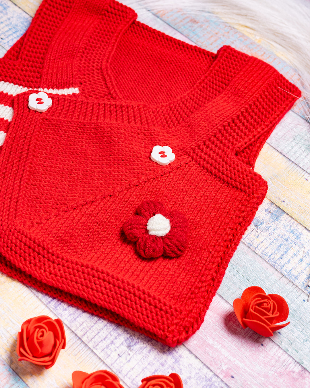 Ročno pleteni telovnik z rožico v rdeči barvi iz 80% akrilne volne in 20% bombaža.