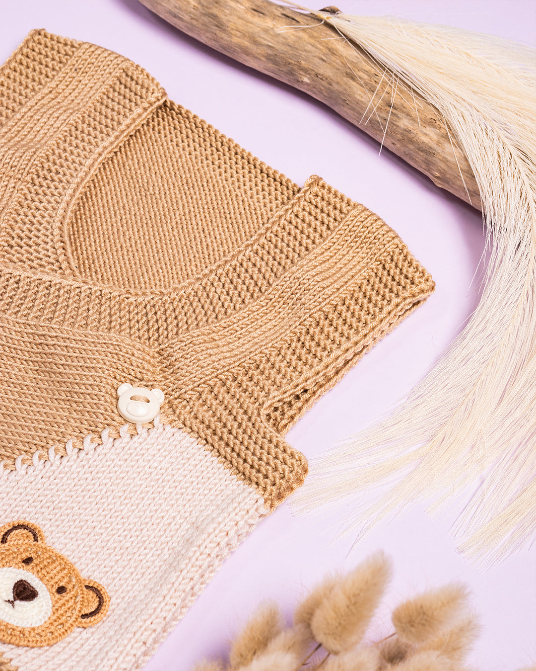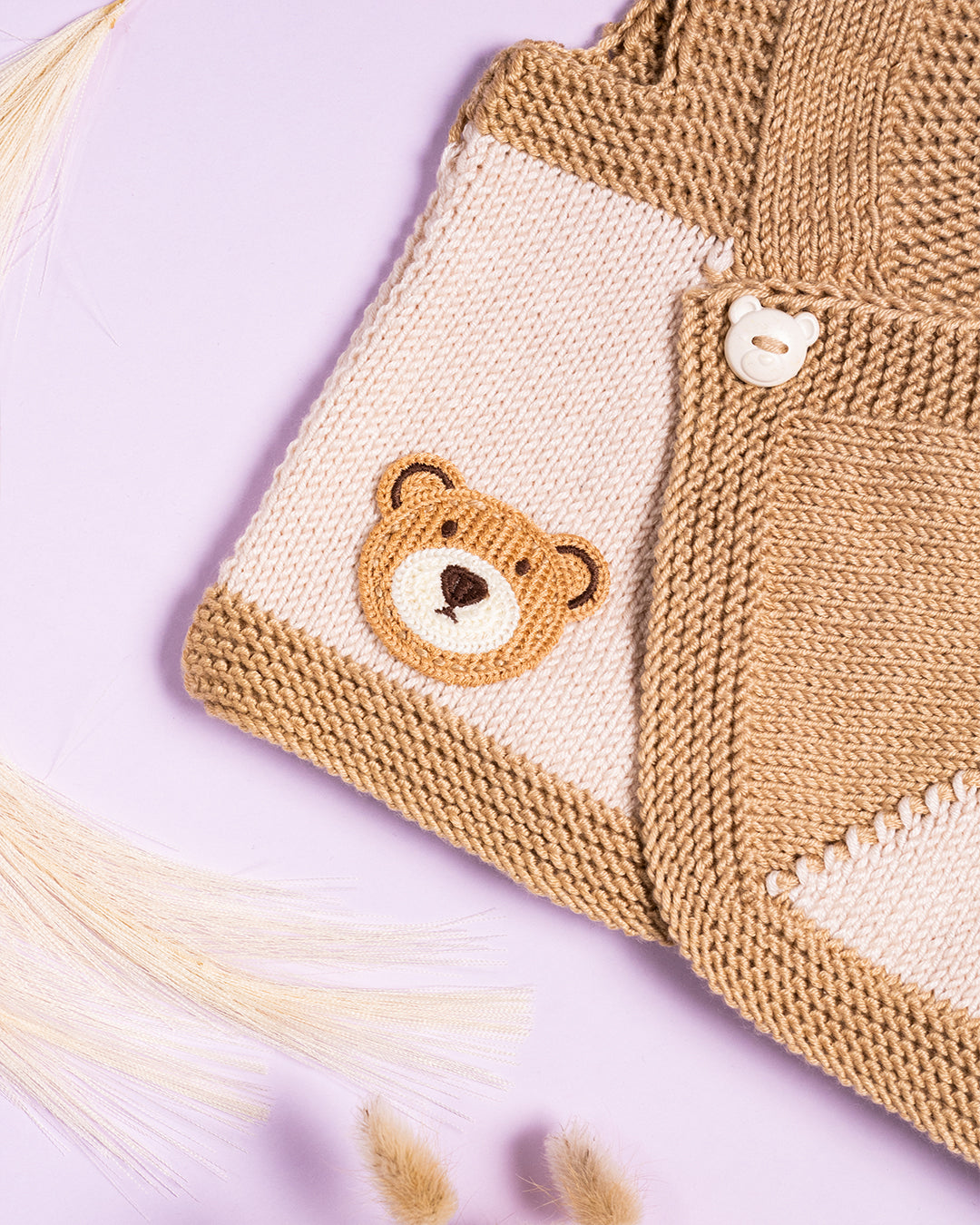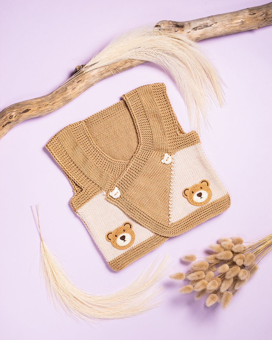 Ročno pleteni rjavi telovnik z medvedki iz 80% akrila in 20% bombaža.