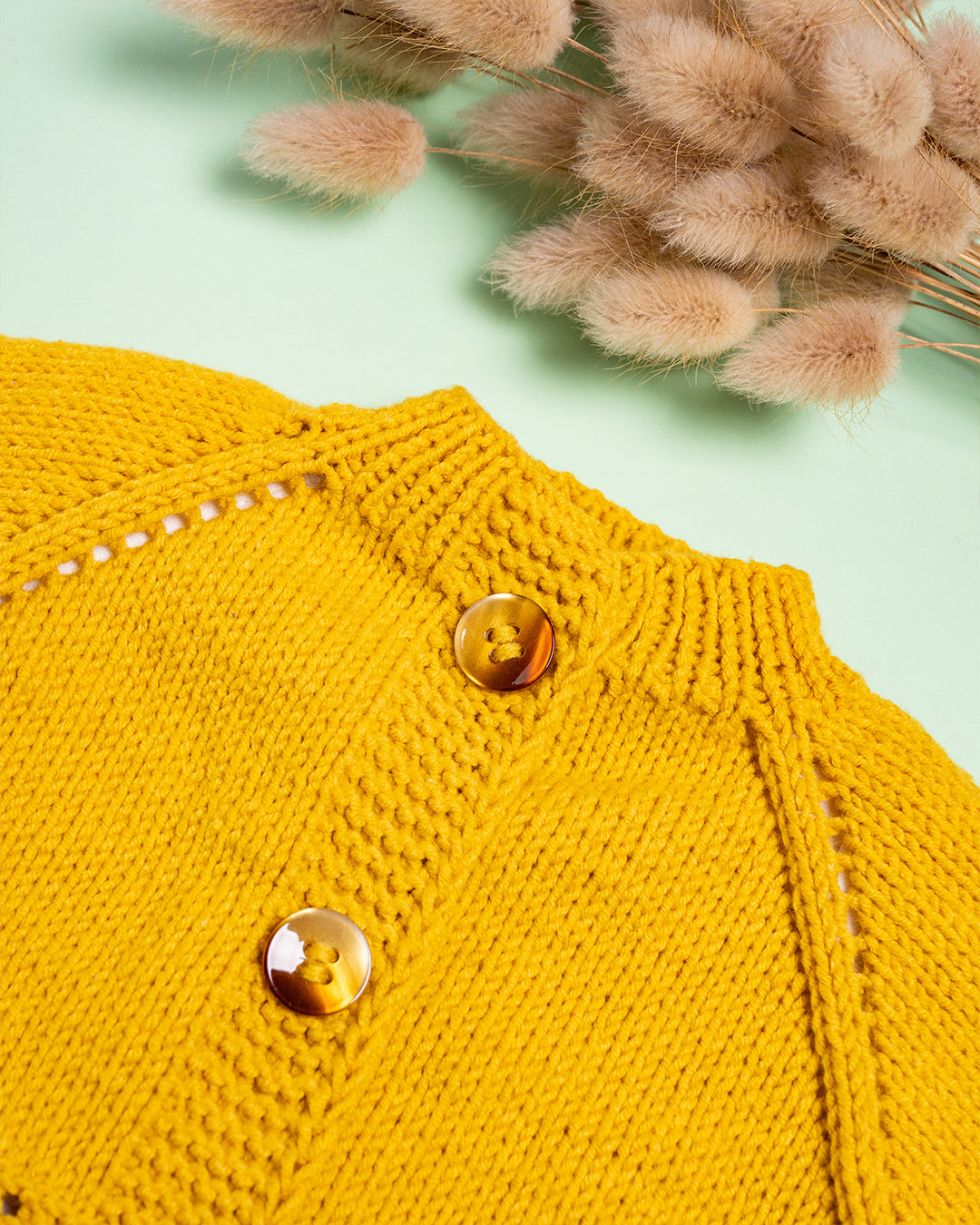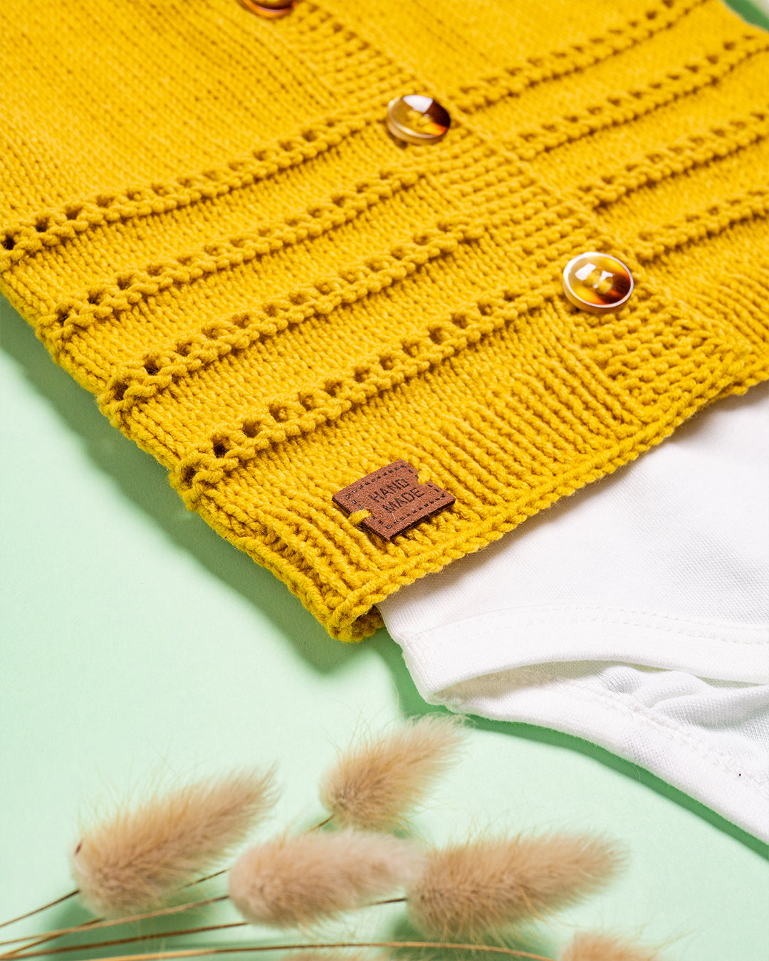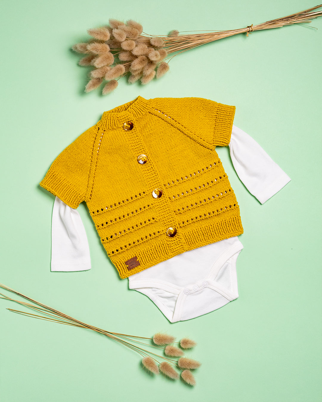 Ročno pleteni puloverček z kratkimi rokavi v rjavi barvi in z zlatimi gumbki iz 100% česanega bombaža.