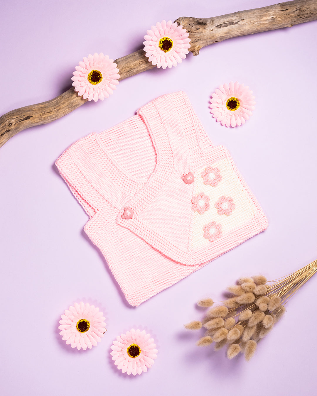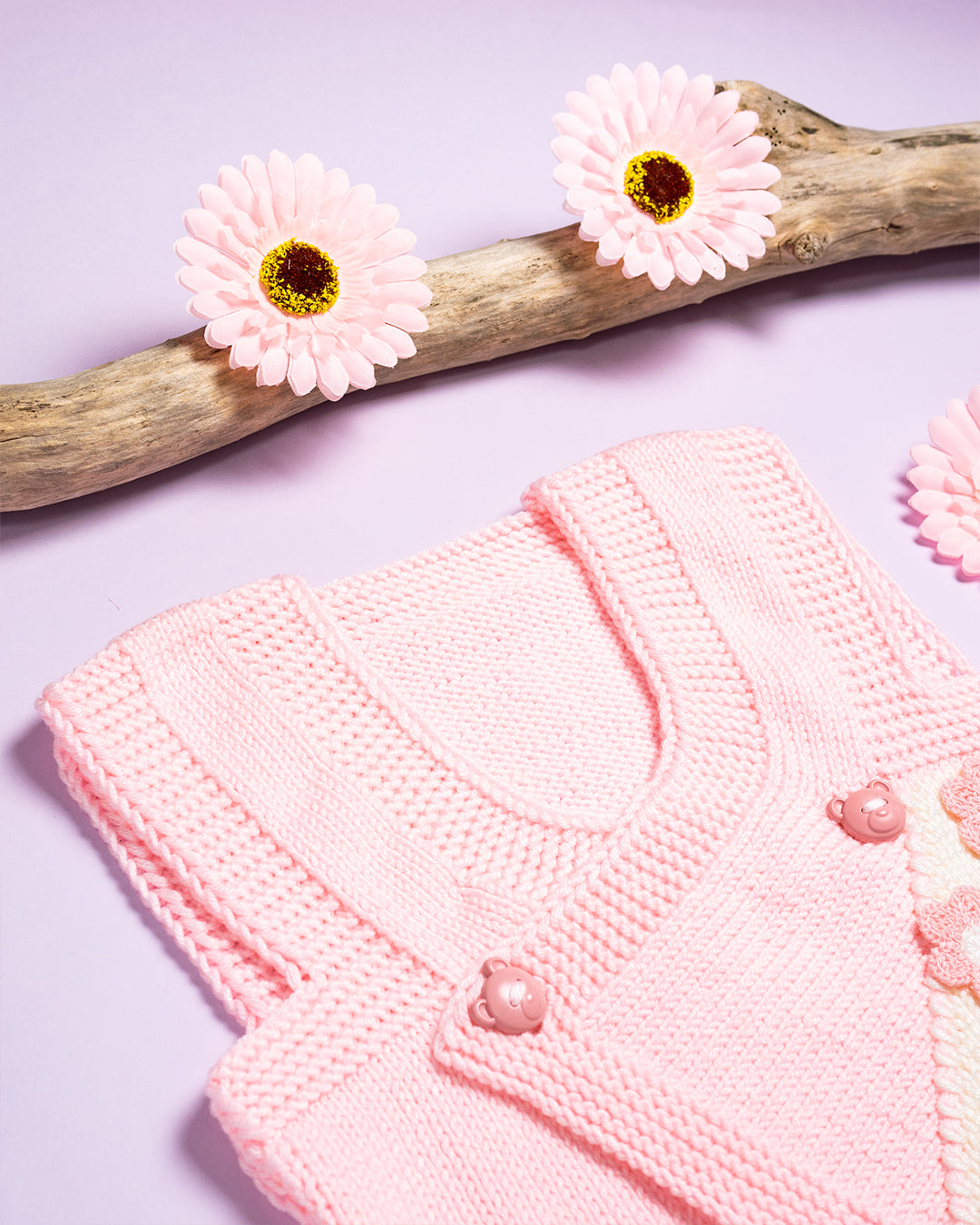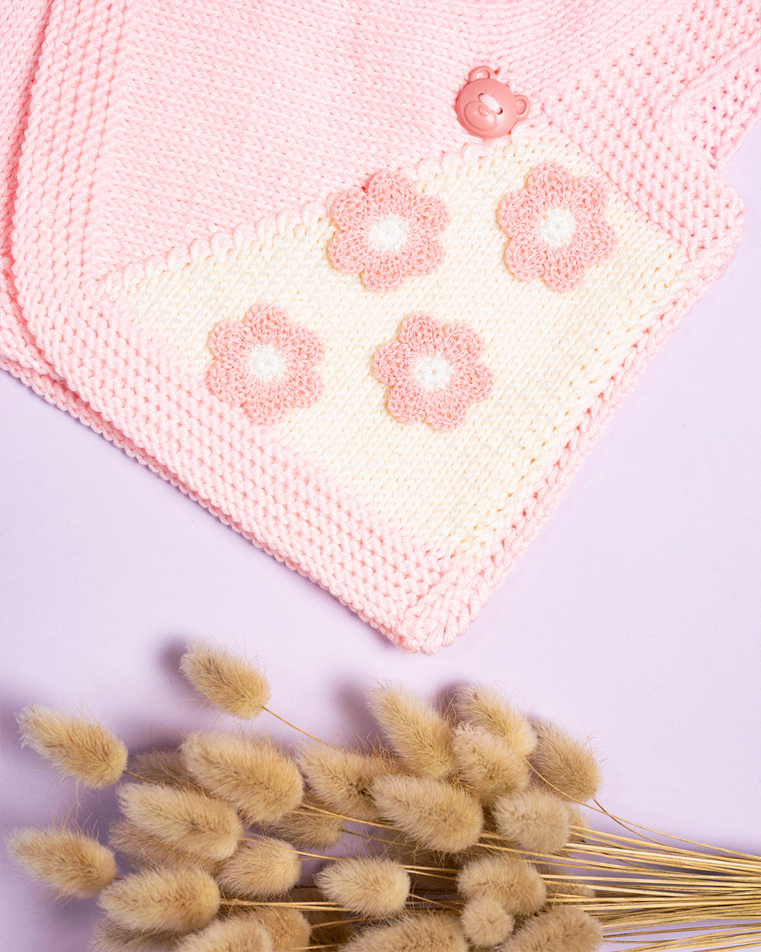 Ročno pleteni roza telovnik z rožicami iz 60% svile, 30% volne in 10% kašmirja.