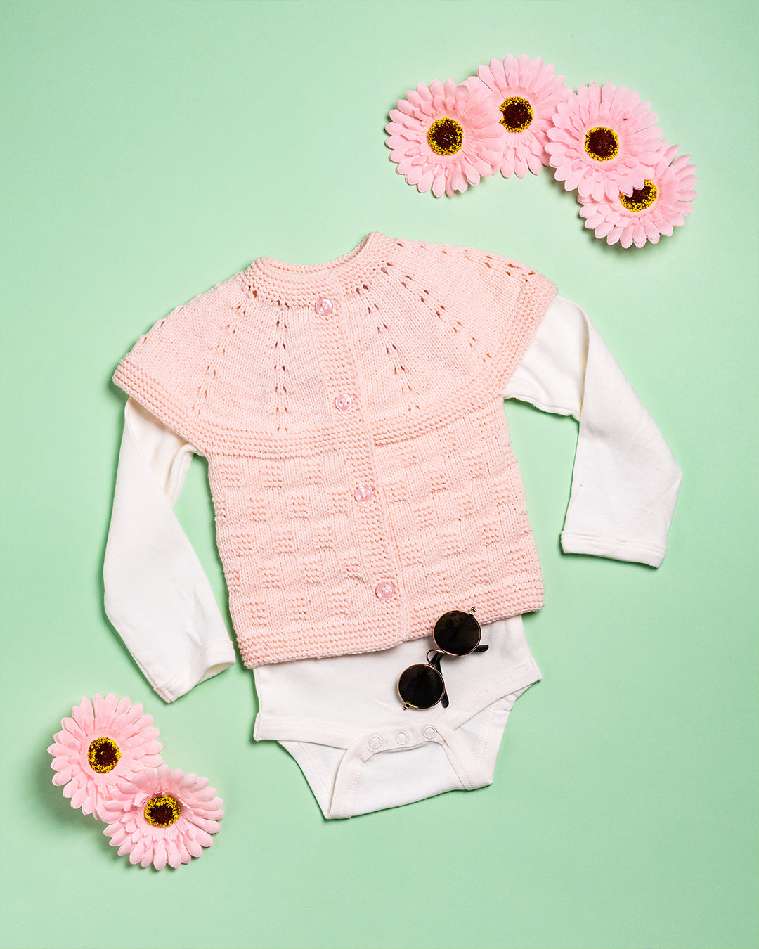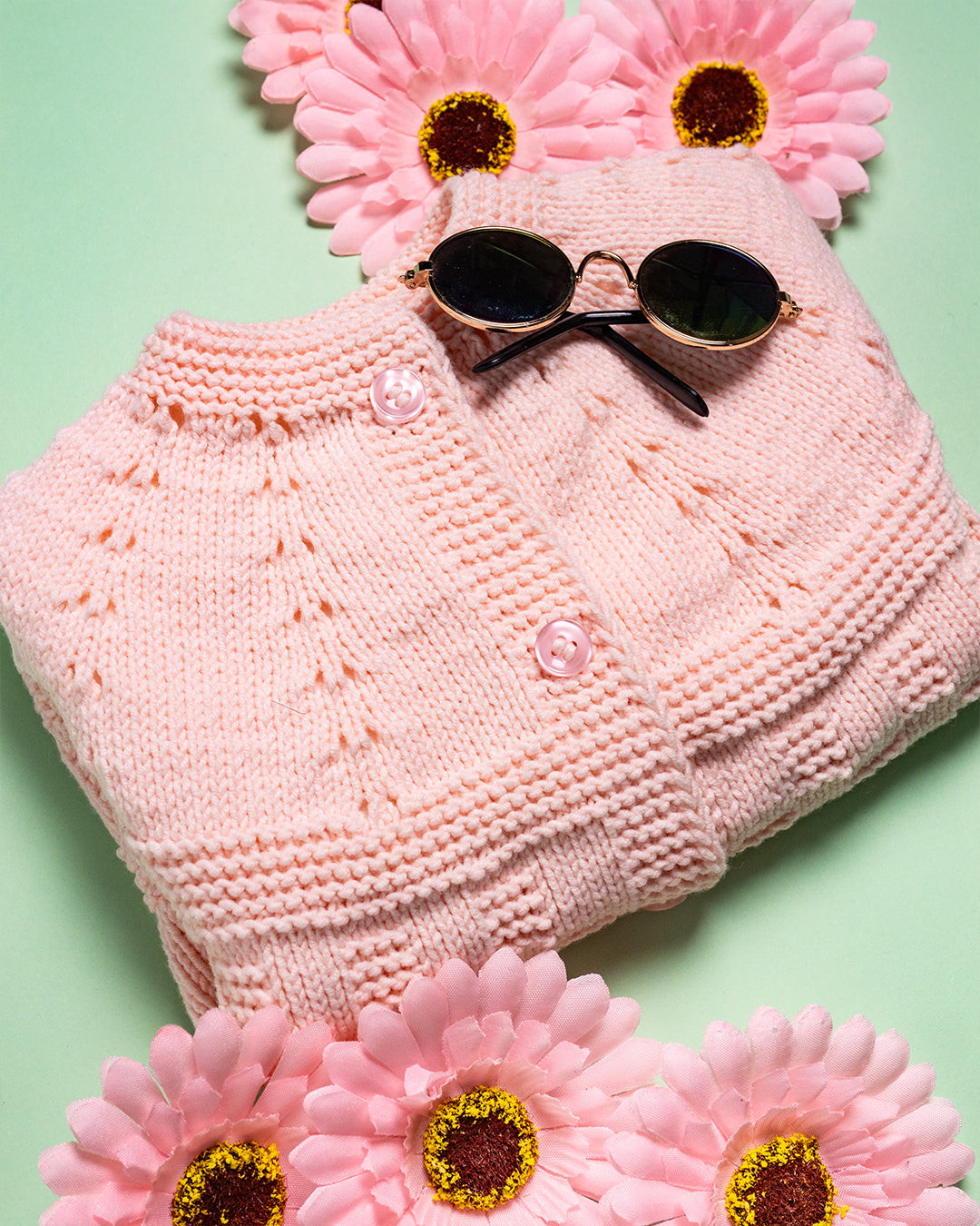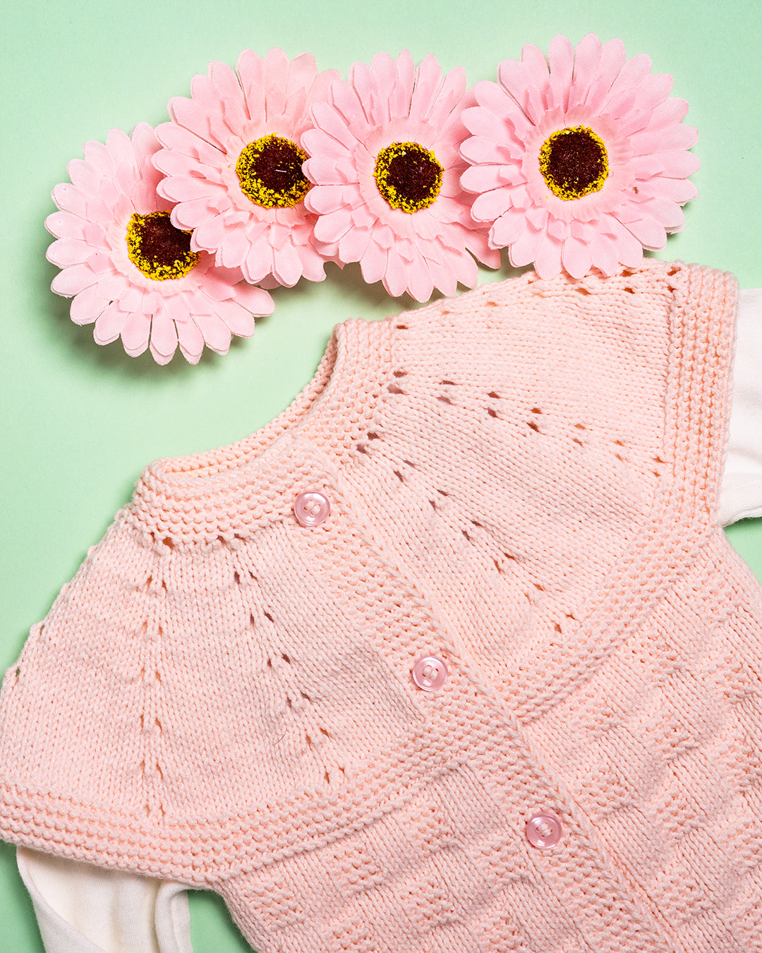 Ročno pleteni puloverček z kratkimi rokavi v roza barvi in roza gumbki iz 100% česanega bombaža.